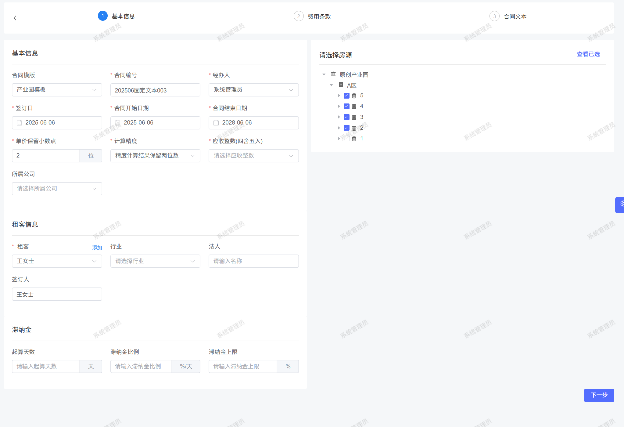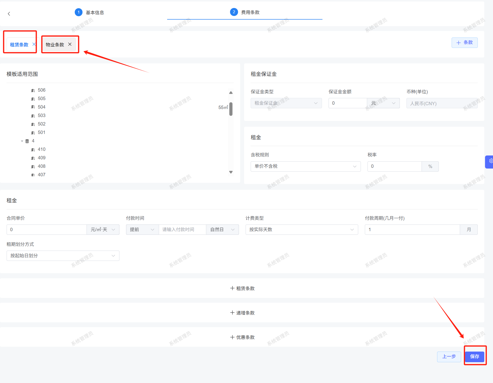 根据实际情况填写完租赁信息后,点击左上角【物业条款】填写物业相关信息。