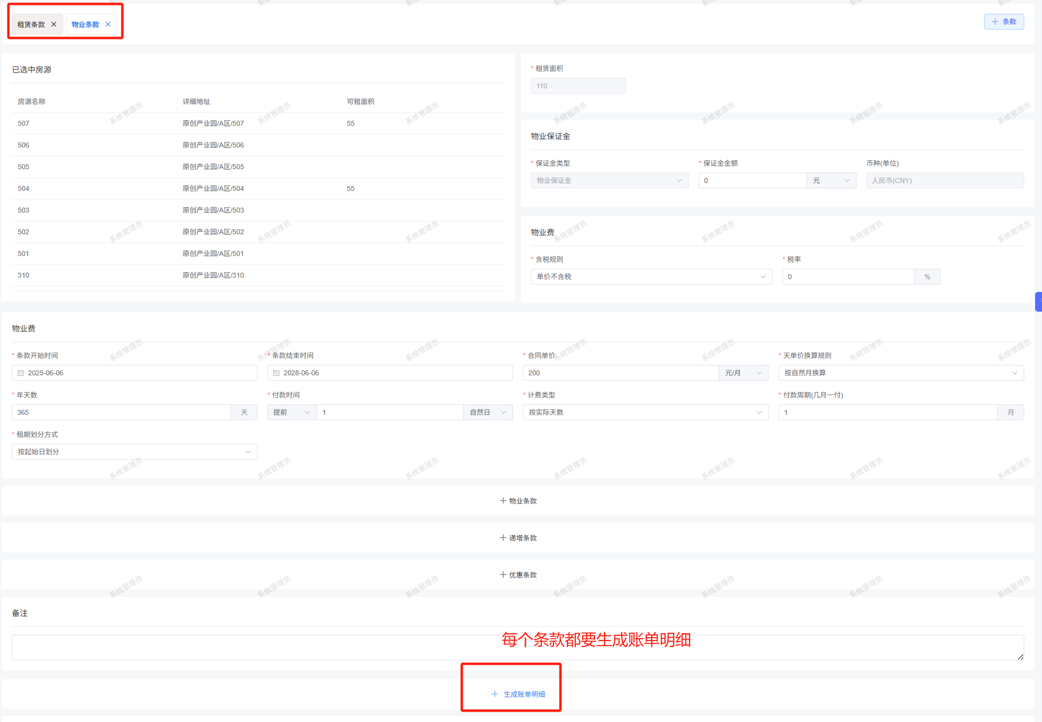 根据实际情况填写完租赁 条款以及物业条款后(注:每个条款都要点击生成账单明细)