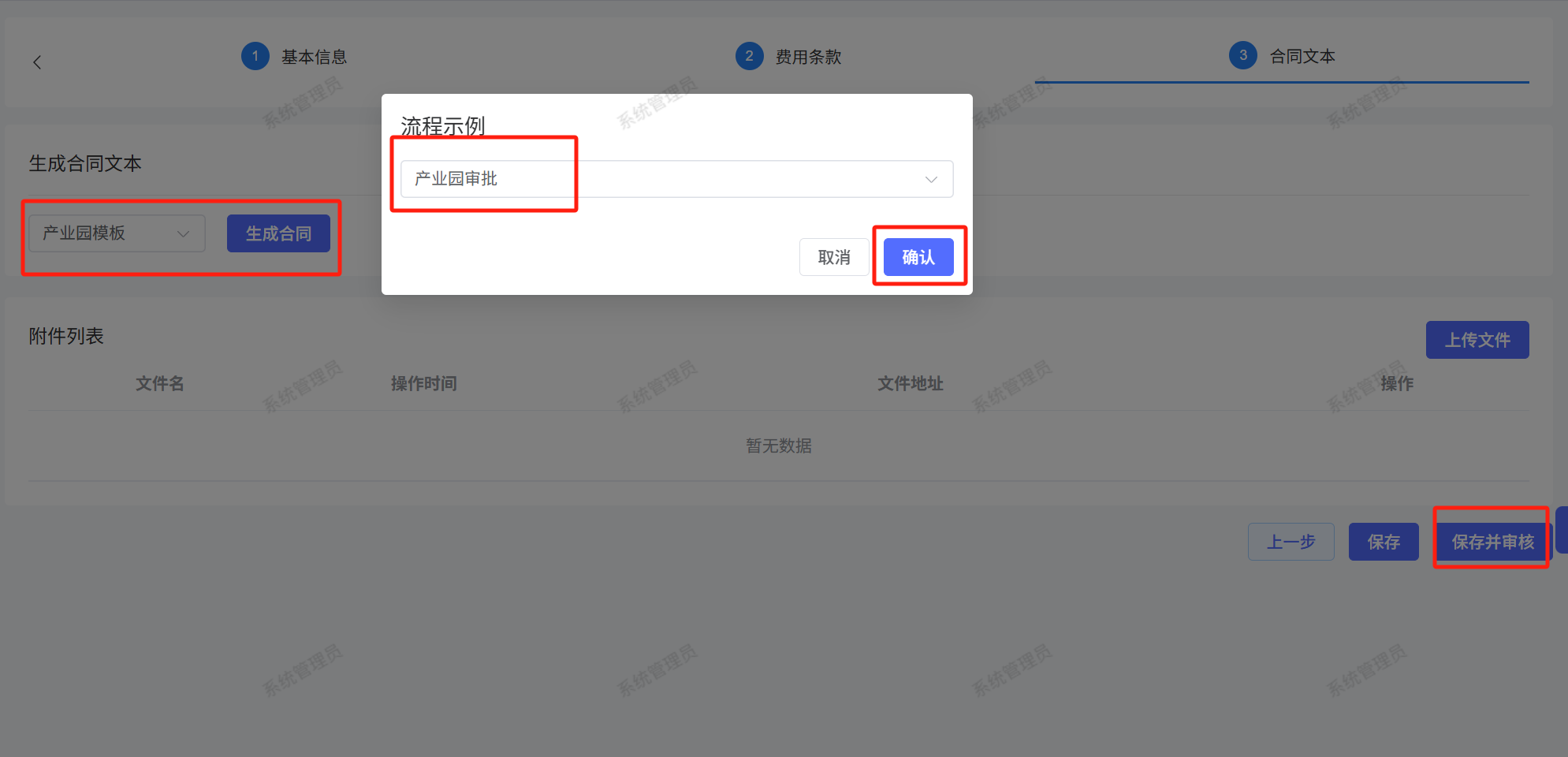 选择打印模板后点击生成合同,点击右边的保存并审核在弹出的页面中选择审批流程即可完成合同的创建