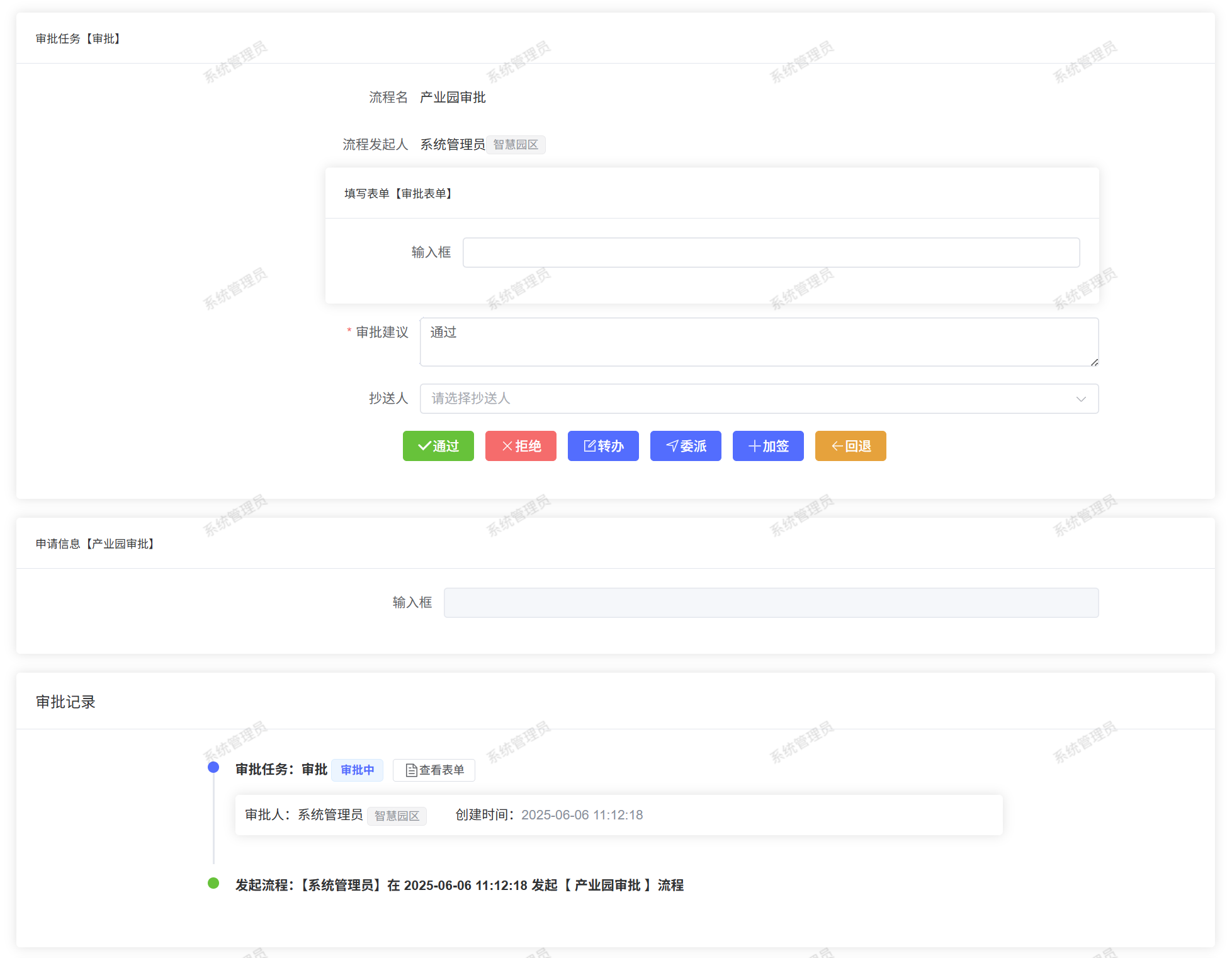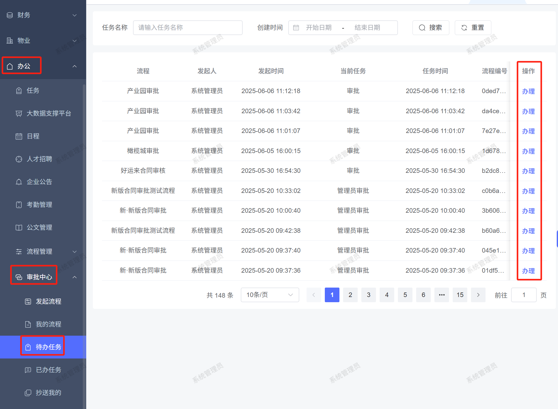 找到需要审批的流程,在该条数据的最右边点击办理,输入审批建议后根据实际情况选择通过活其他操作