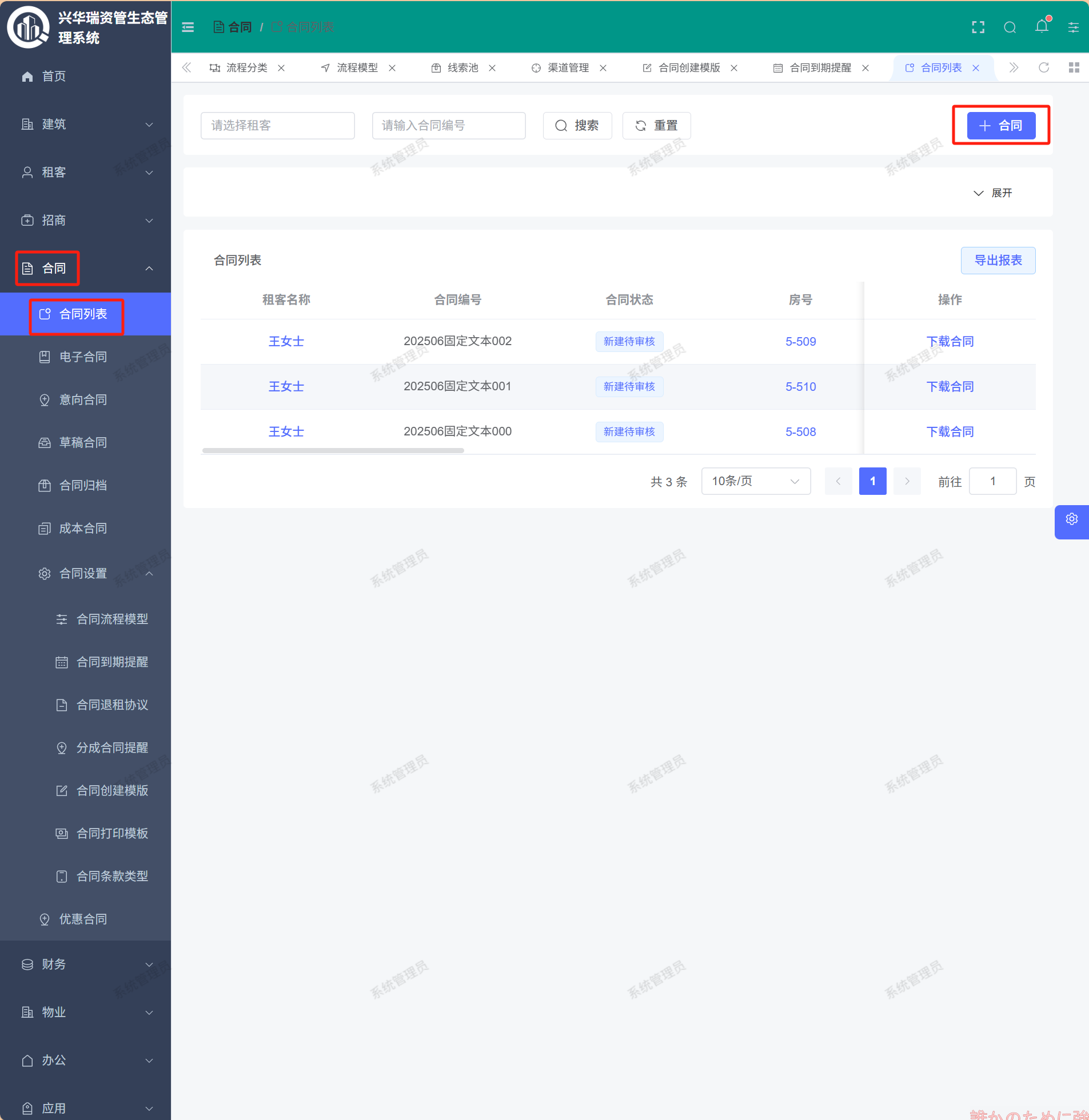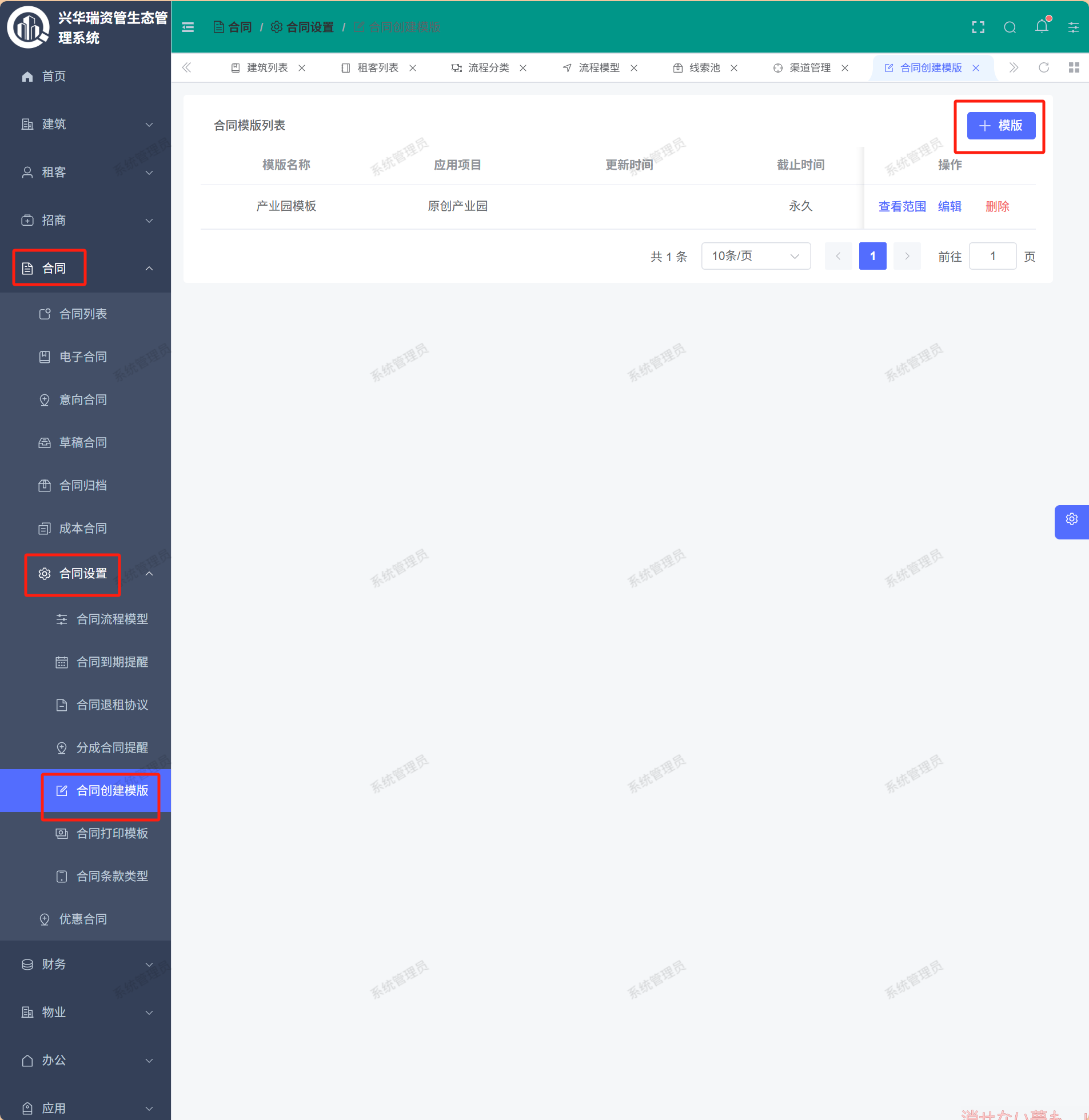 页面路径:【合同】——【合同设置】——【合同创建模板】 点击页面右上角【模板】