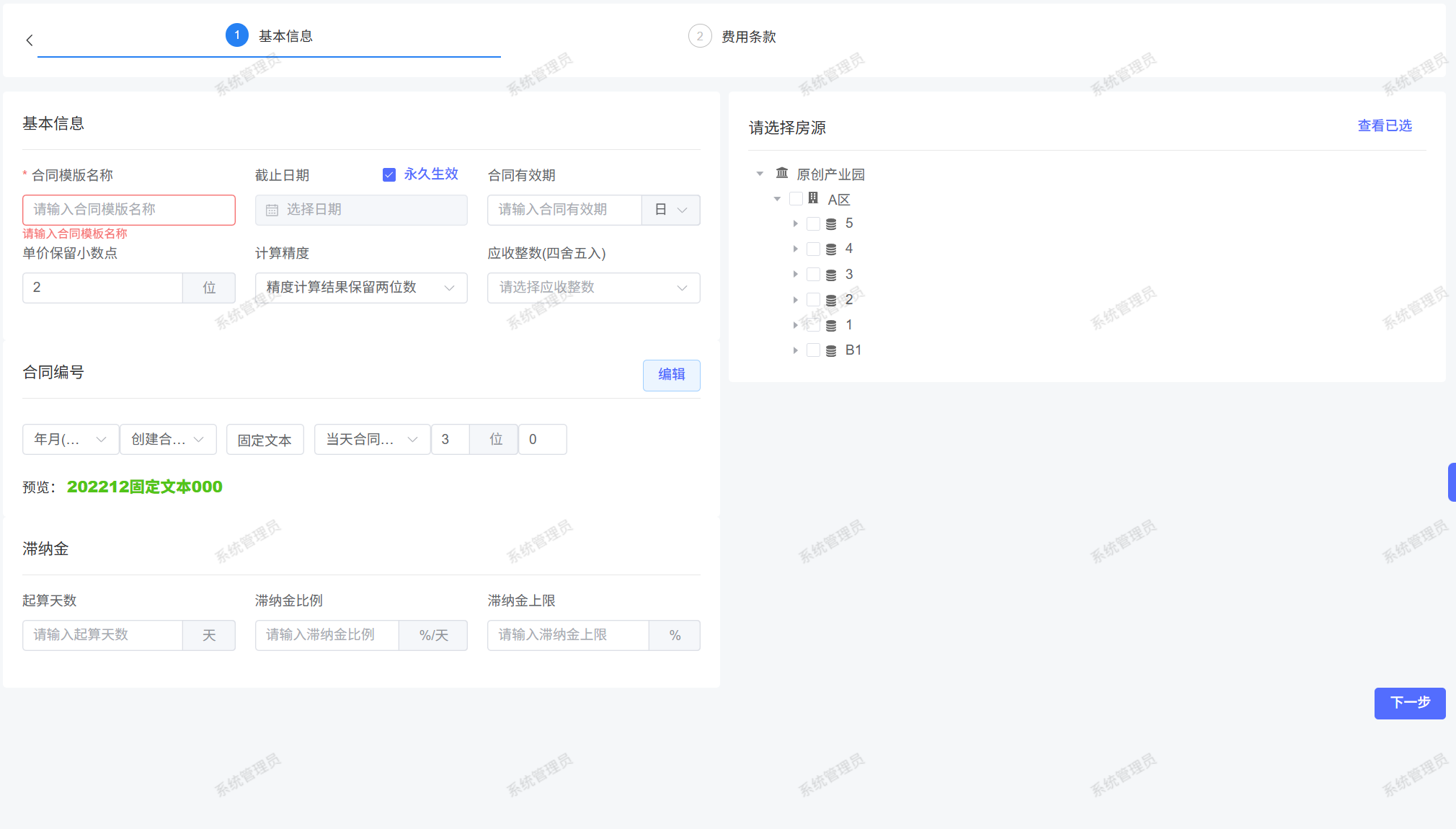 在打开的页面中,选择之前创建的模板,并填写相关信息,并点击页面右下角【下一步】进入费用条款填写页面