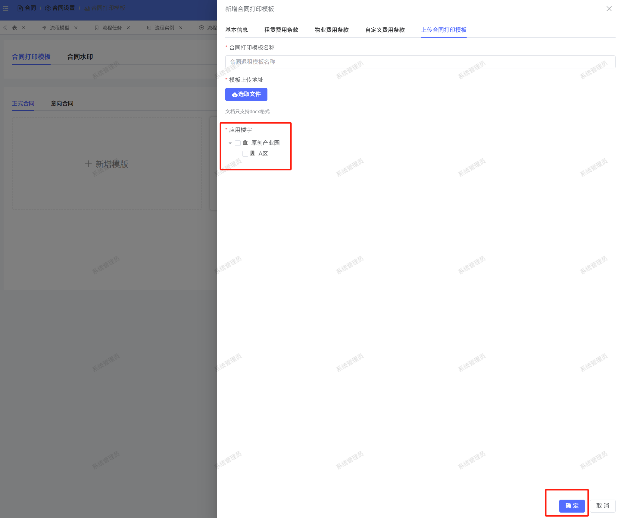 模板上传后需要选择楼宇,以便于后期只有指定的楼宇才可使用改模板。