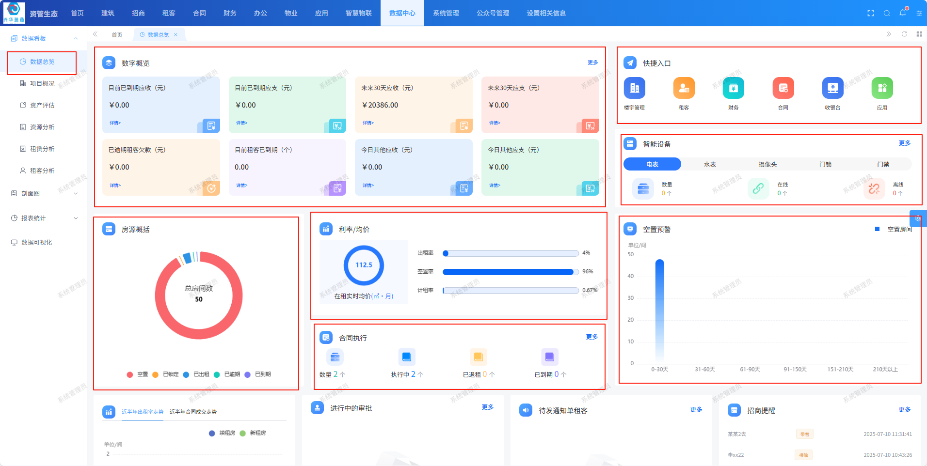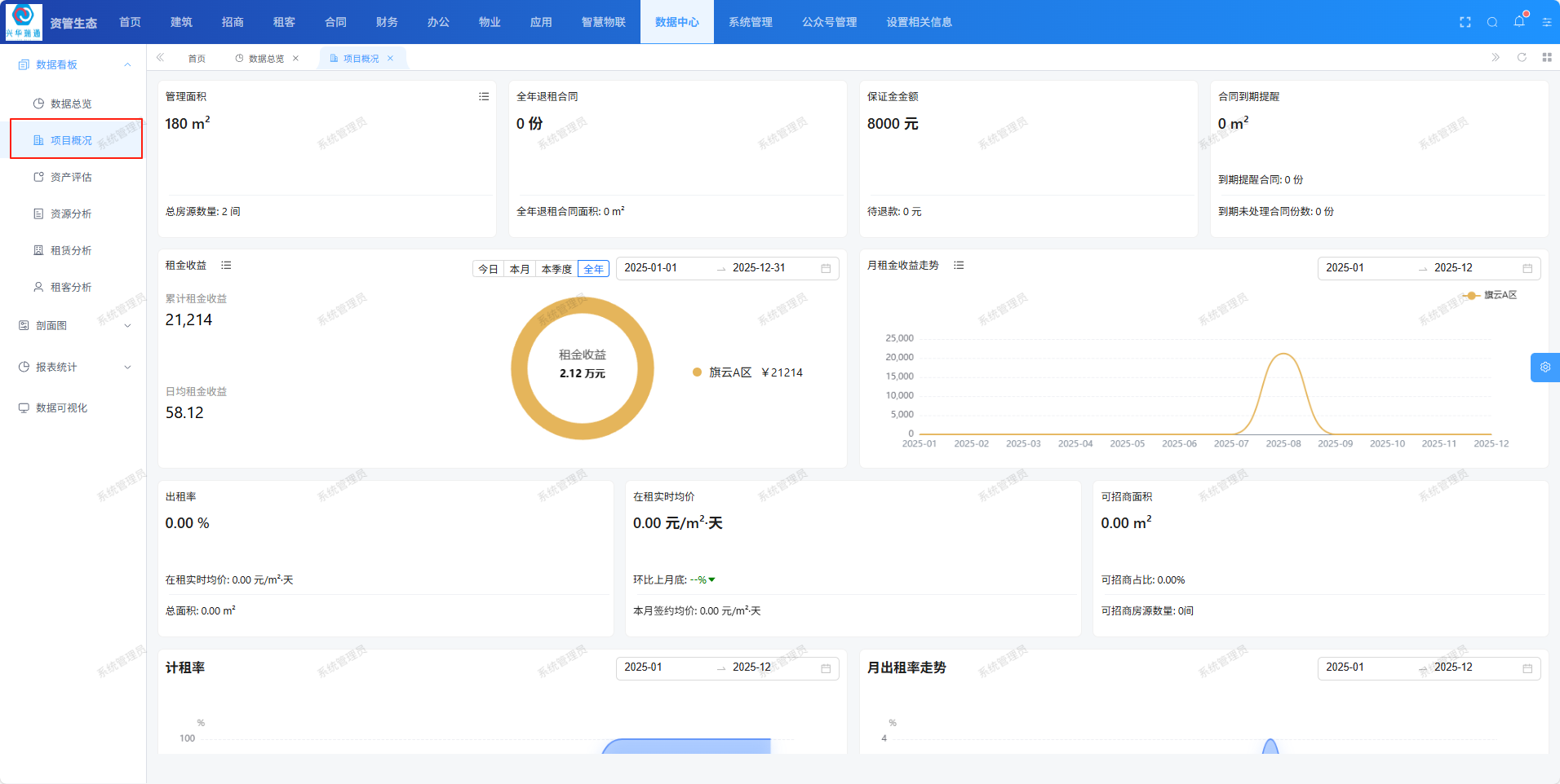 项目概况页面用于查看资产管理面积、保证金金额、租金收益、出租率、在租实时均价等等 信息