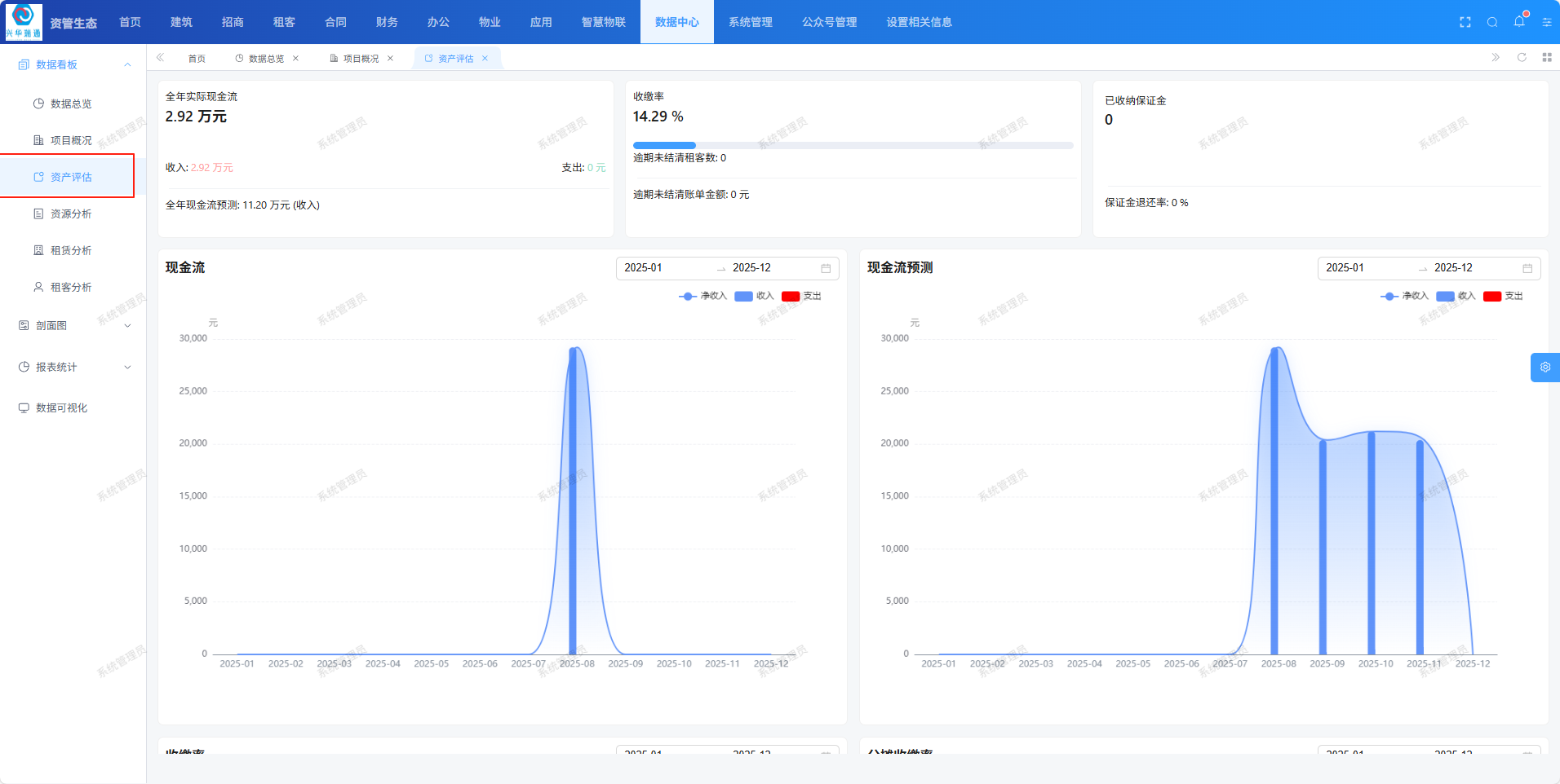 资产评估页面用于查看现金流、现金流预测、收缴率、分摊收缴率、收益等信息