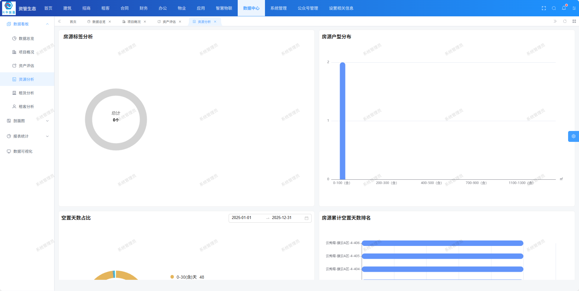 资源分析页面用于查看房源户型分布、空置天数占比、房源标签分析、给类排名等 信息