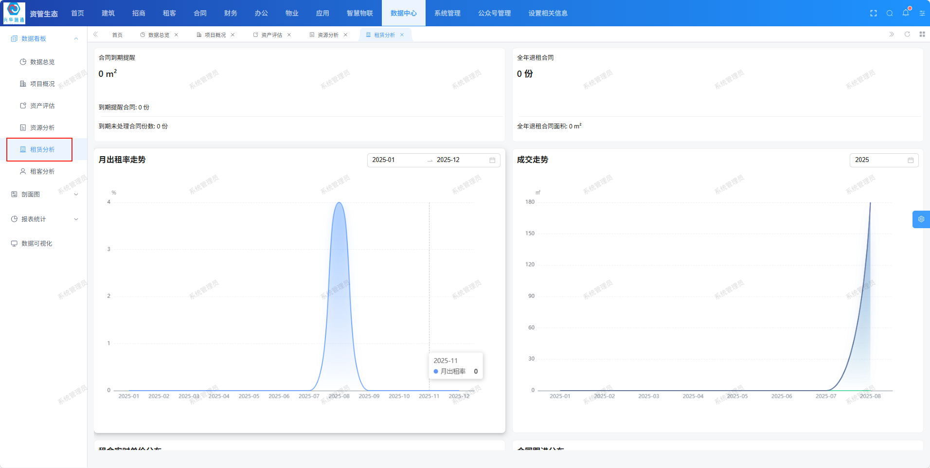 租赁分析页面用于查看月出租率走势、成交走势、租金实时单价分布、合同跟进分布、合同到期分布、租期结构分析等信息