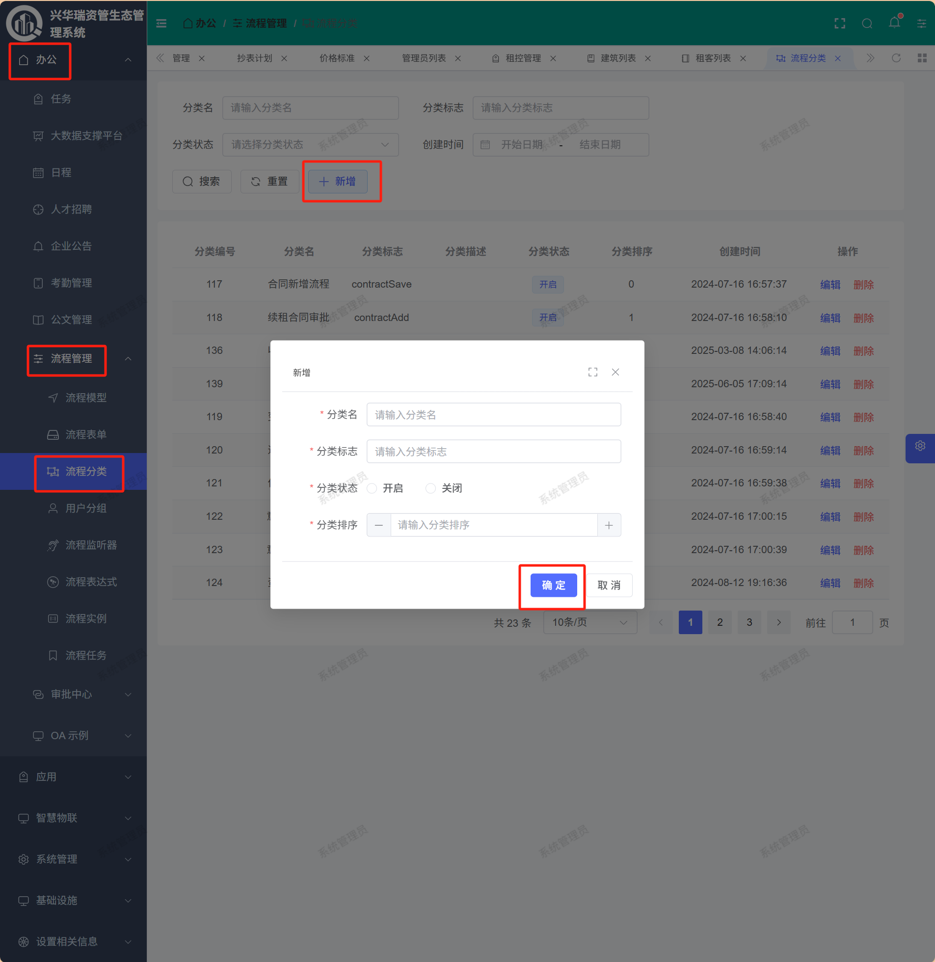 点击页面的【新增】,根据实际情况填写完毕后点击【确定】即可完成新增流程分类