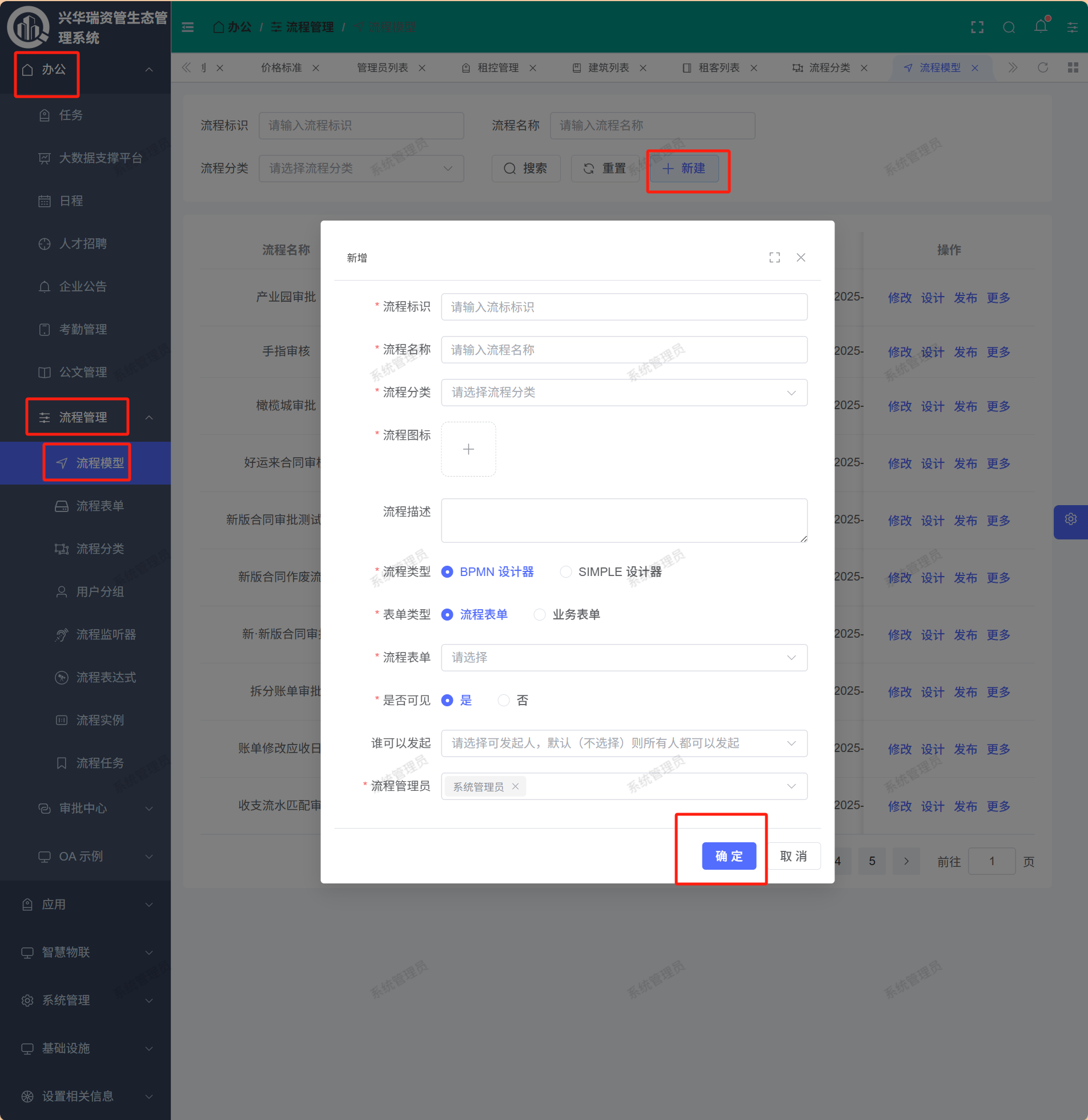 点击页面的【新增】,根据实际情况填写完毕后点击【确定】即可完成新增流程模型