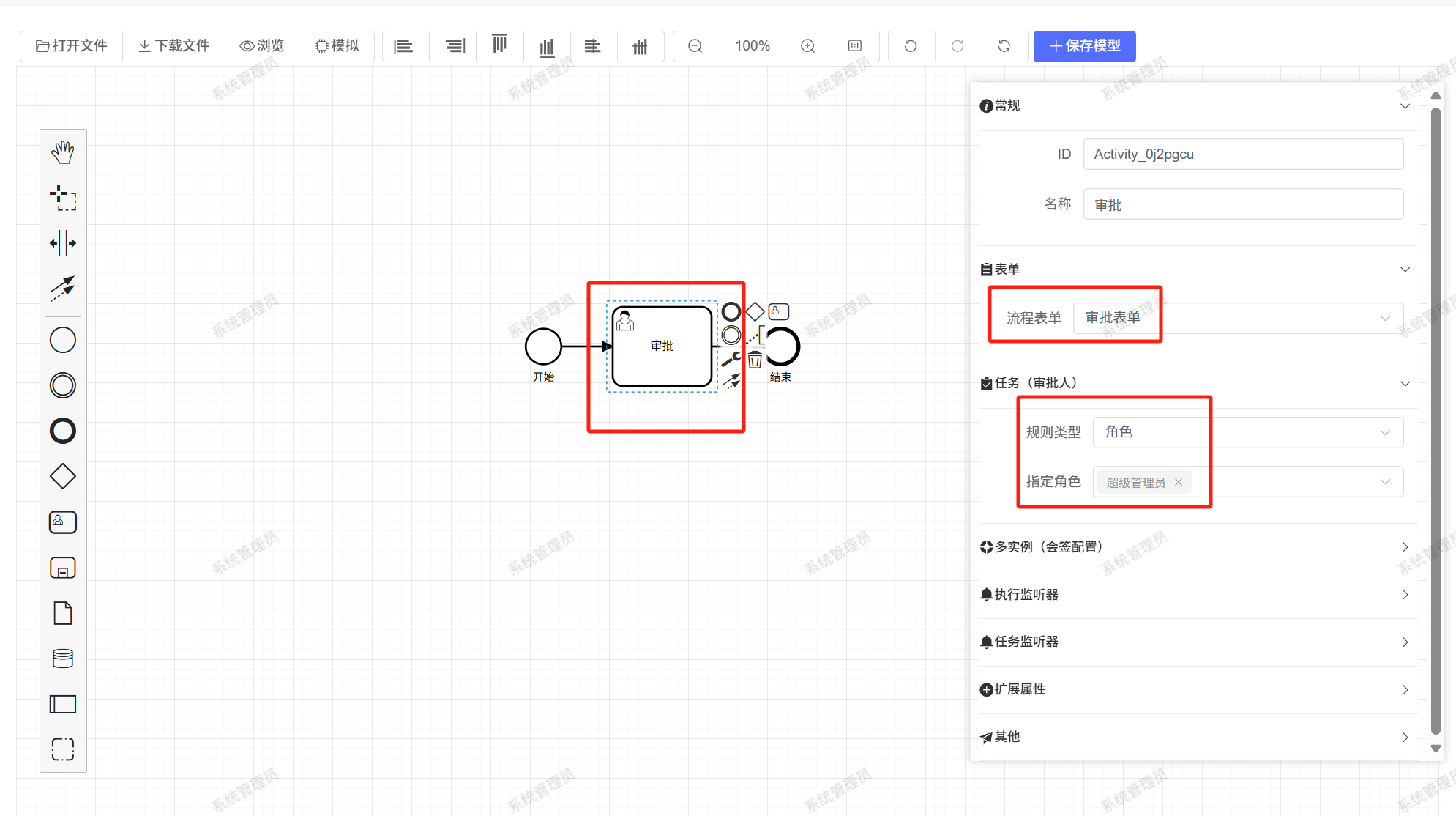 下图为简单的需要一个人审核的流程,在任务栏中可选择审批人类型。设置完成后点击上方保存模型按钮即可对流程进行保存