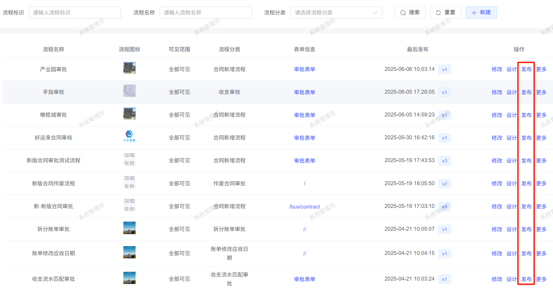 保存完成后,点击【发布】按钮,即可完成流程发布