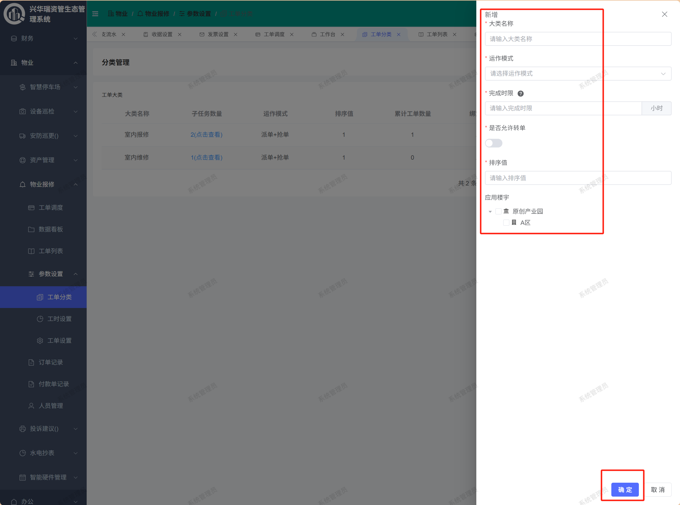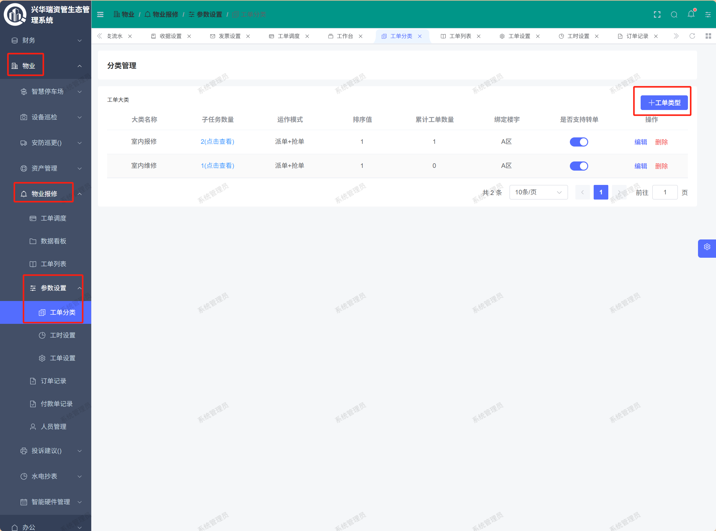 页面路径:【物业】——【物业报修】——【参数设置】——【工单分类】
