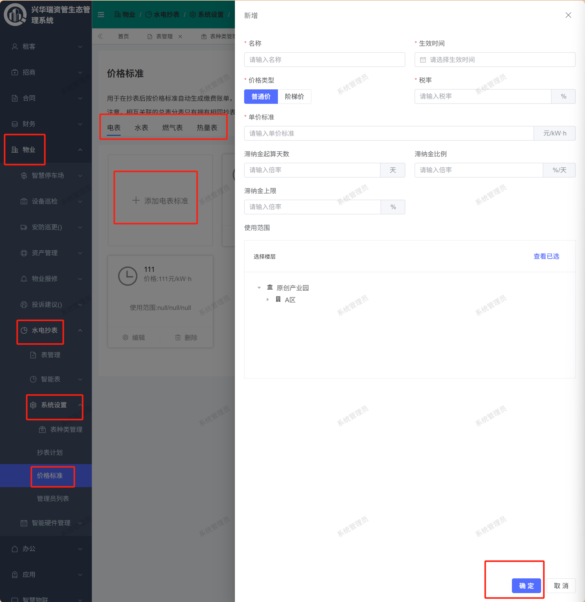 页面路径:【物业】——【水电抄表】——【系统设置】——【价格标准】