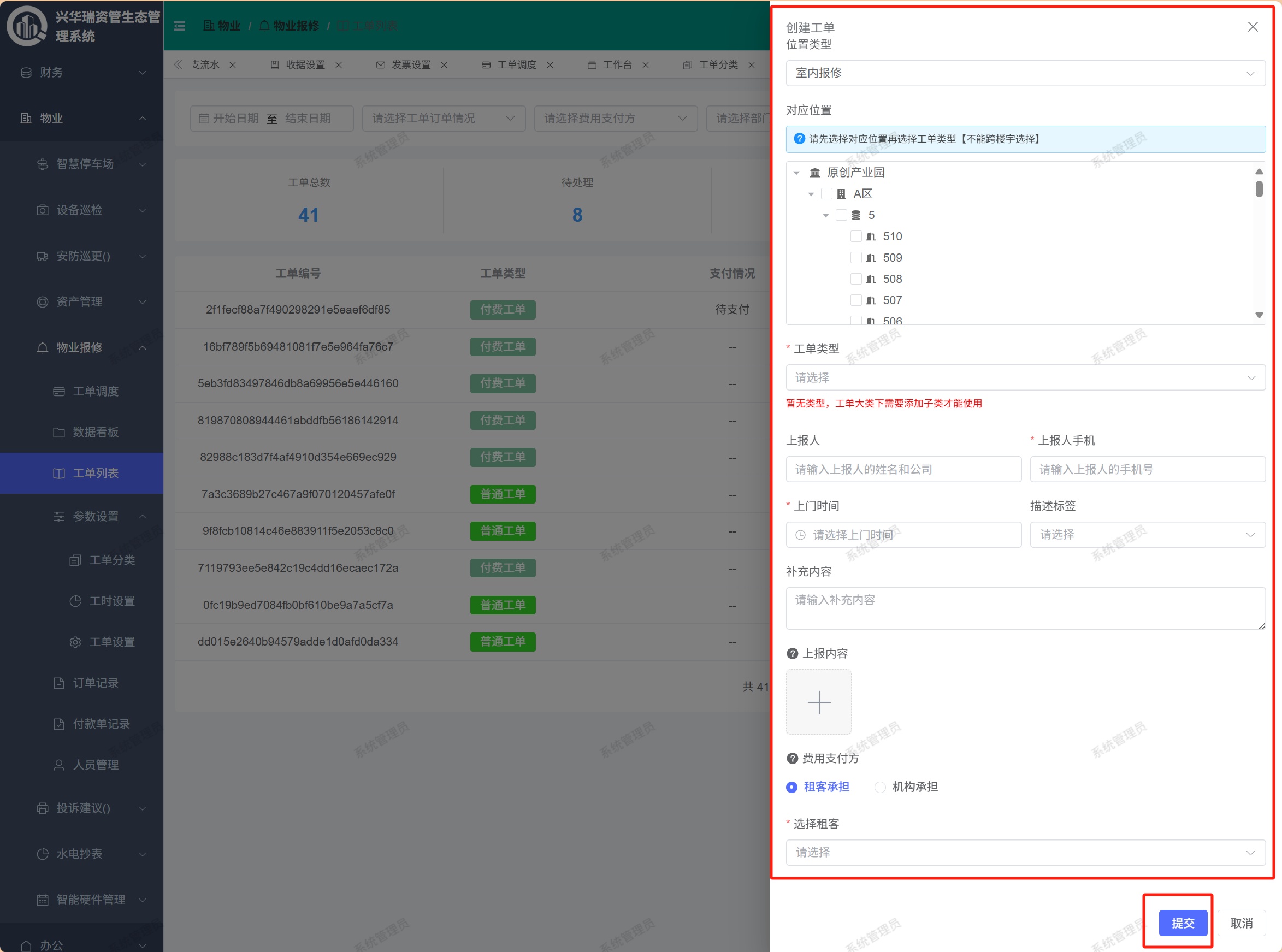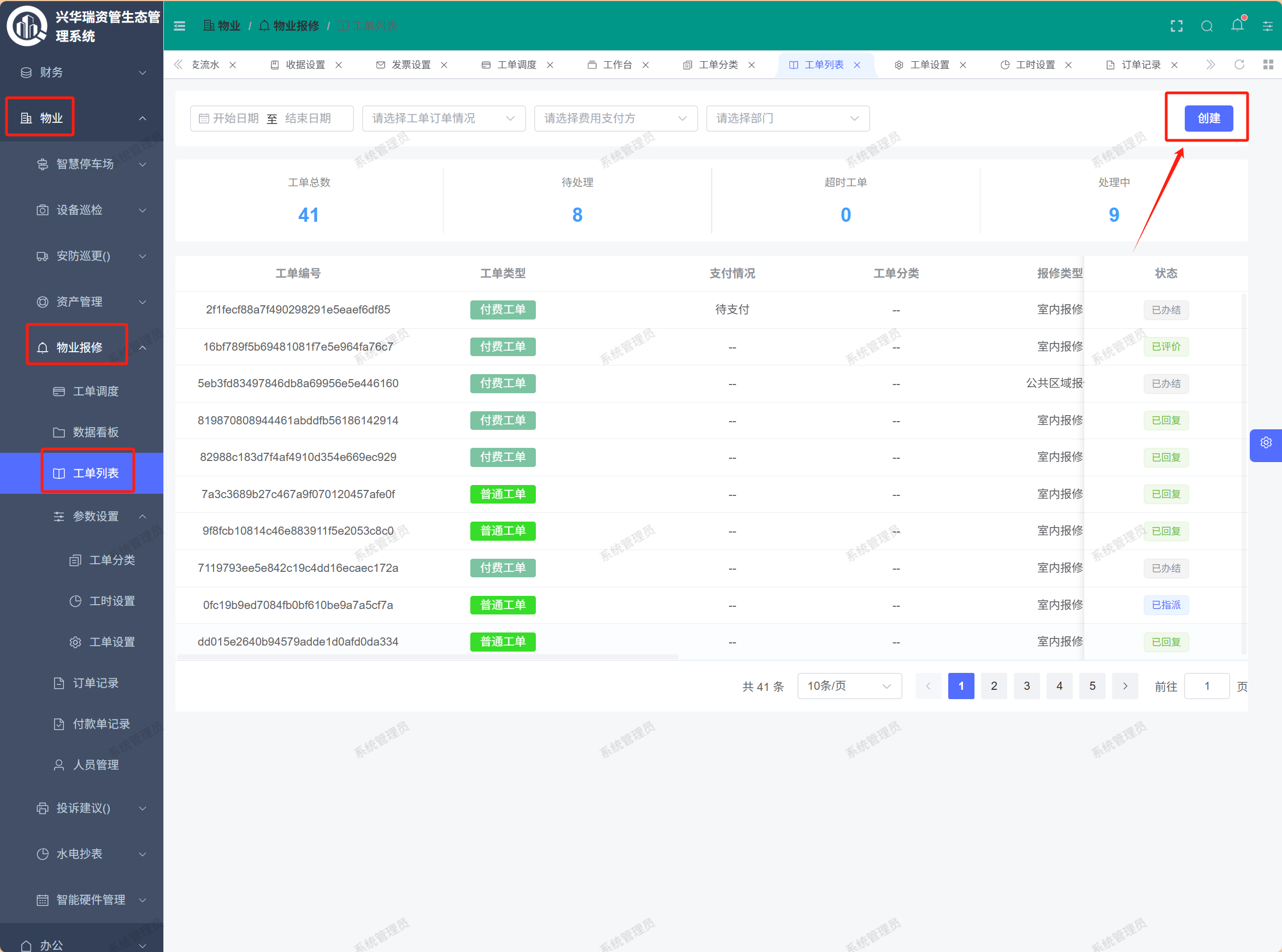页面路径:【物业】——【物业保修】——【工单列表】