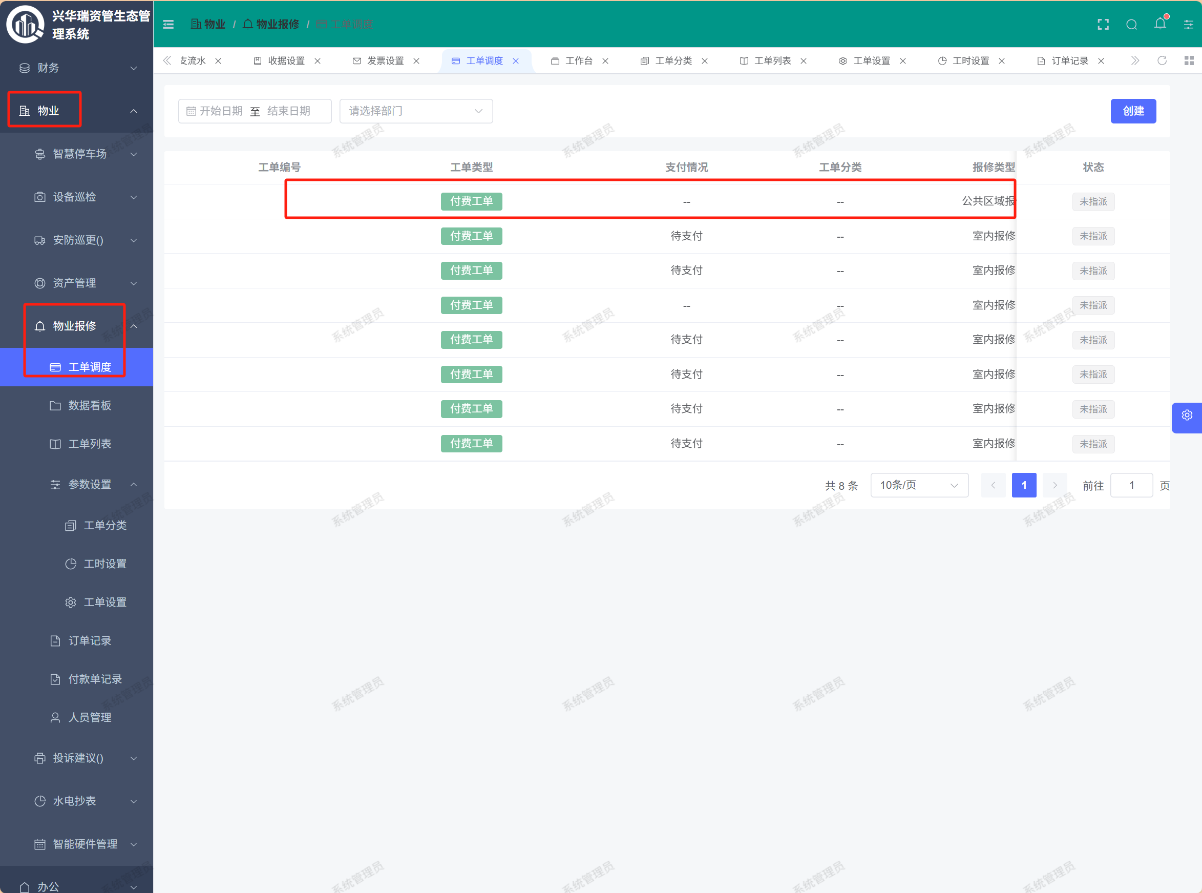 页面路径:【物业】——【物业保修】——【工单调度】