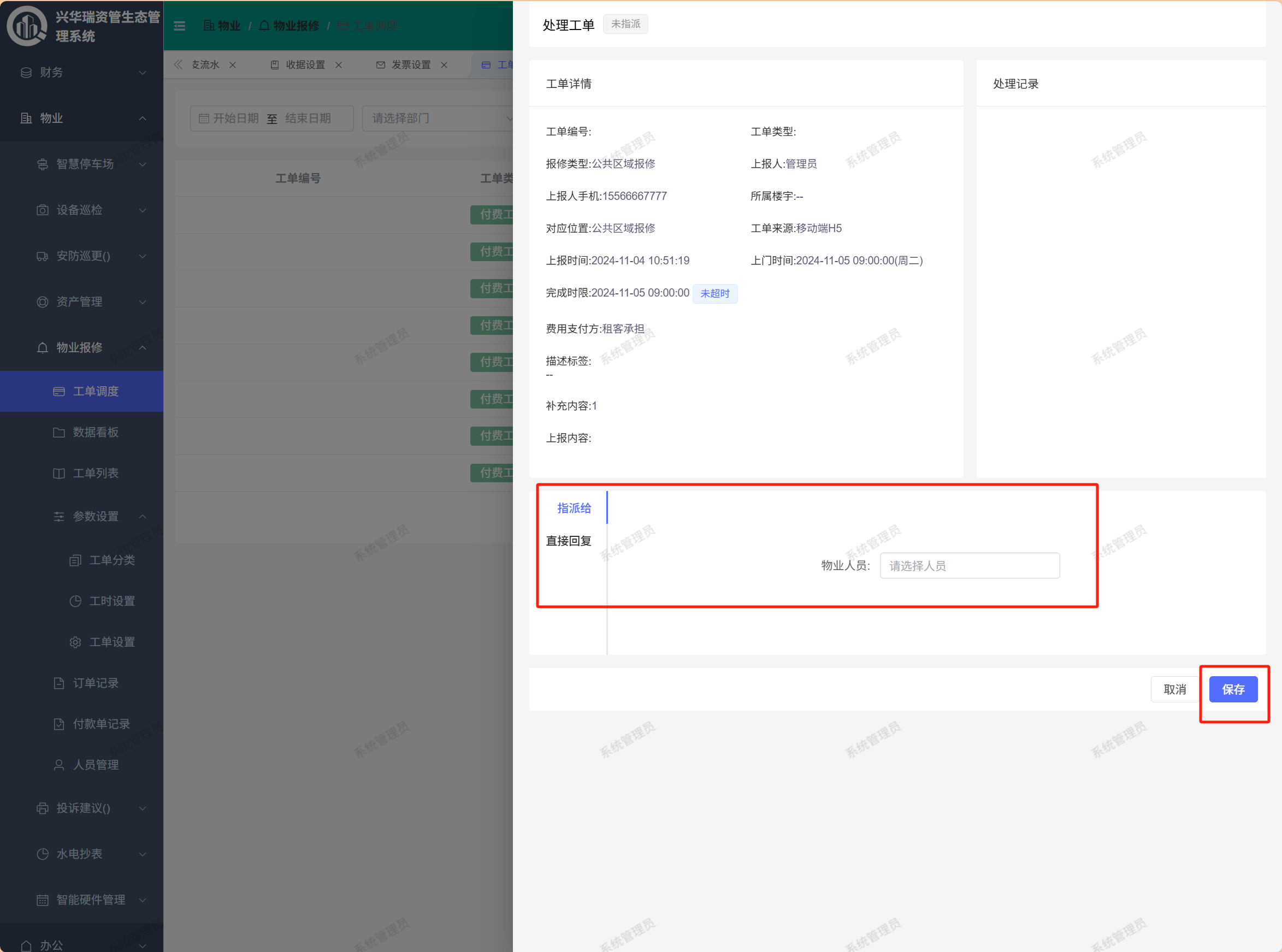 选择需要指派的人员后,点击右下角的【保存】即可完成指派工单