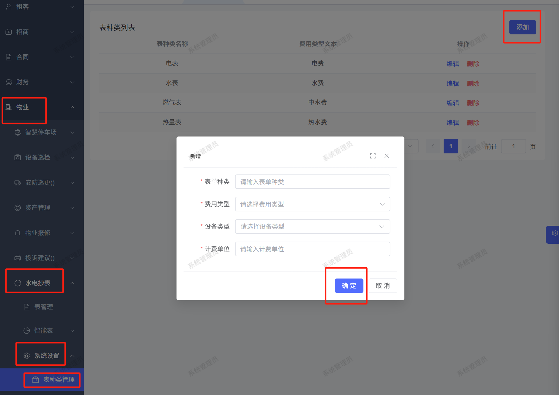 页面路径:【物业】——【水电抄表】——【系统设置】——【表种类设置】