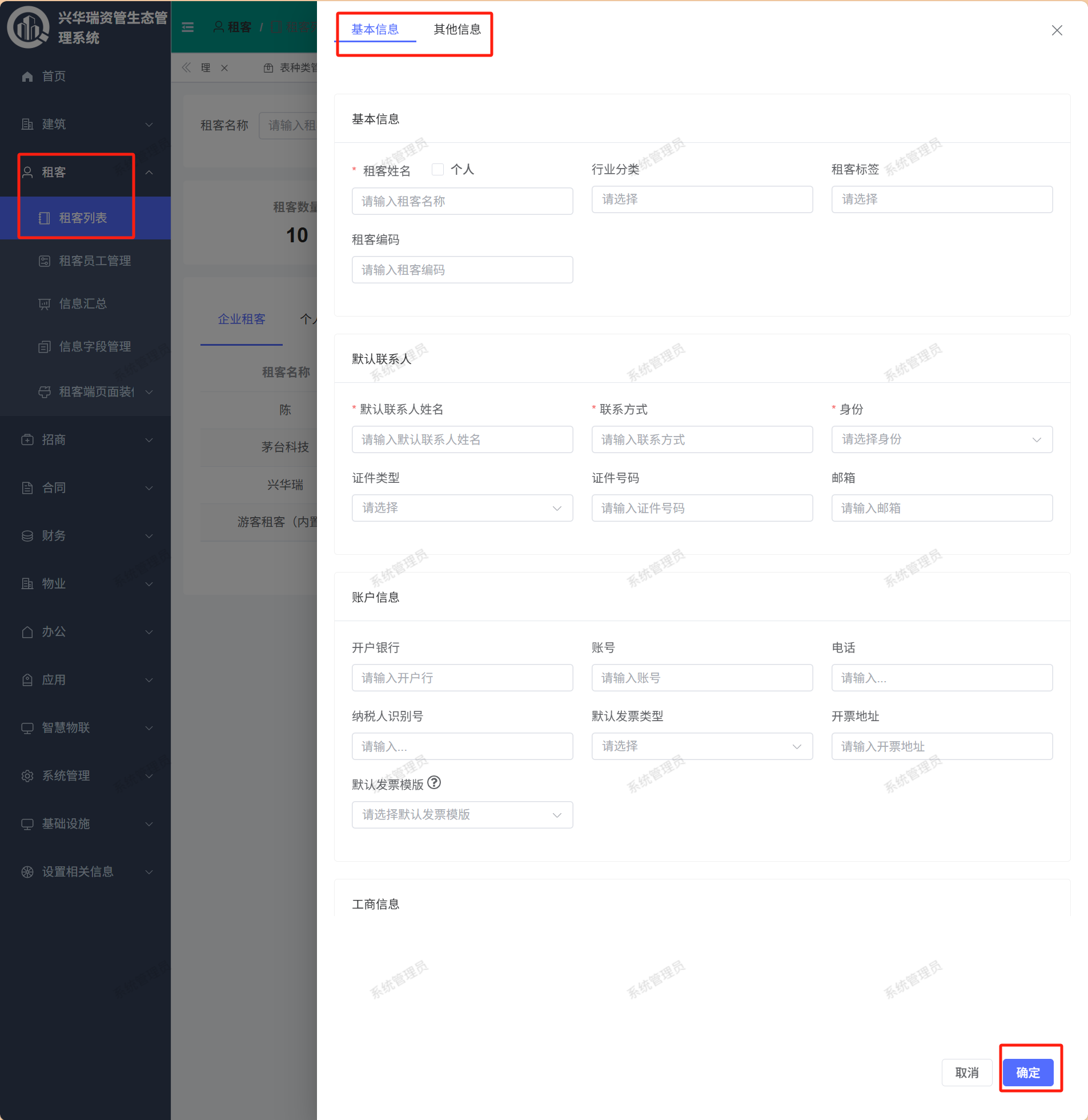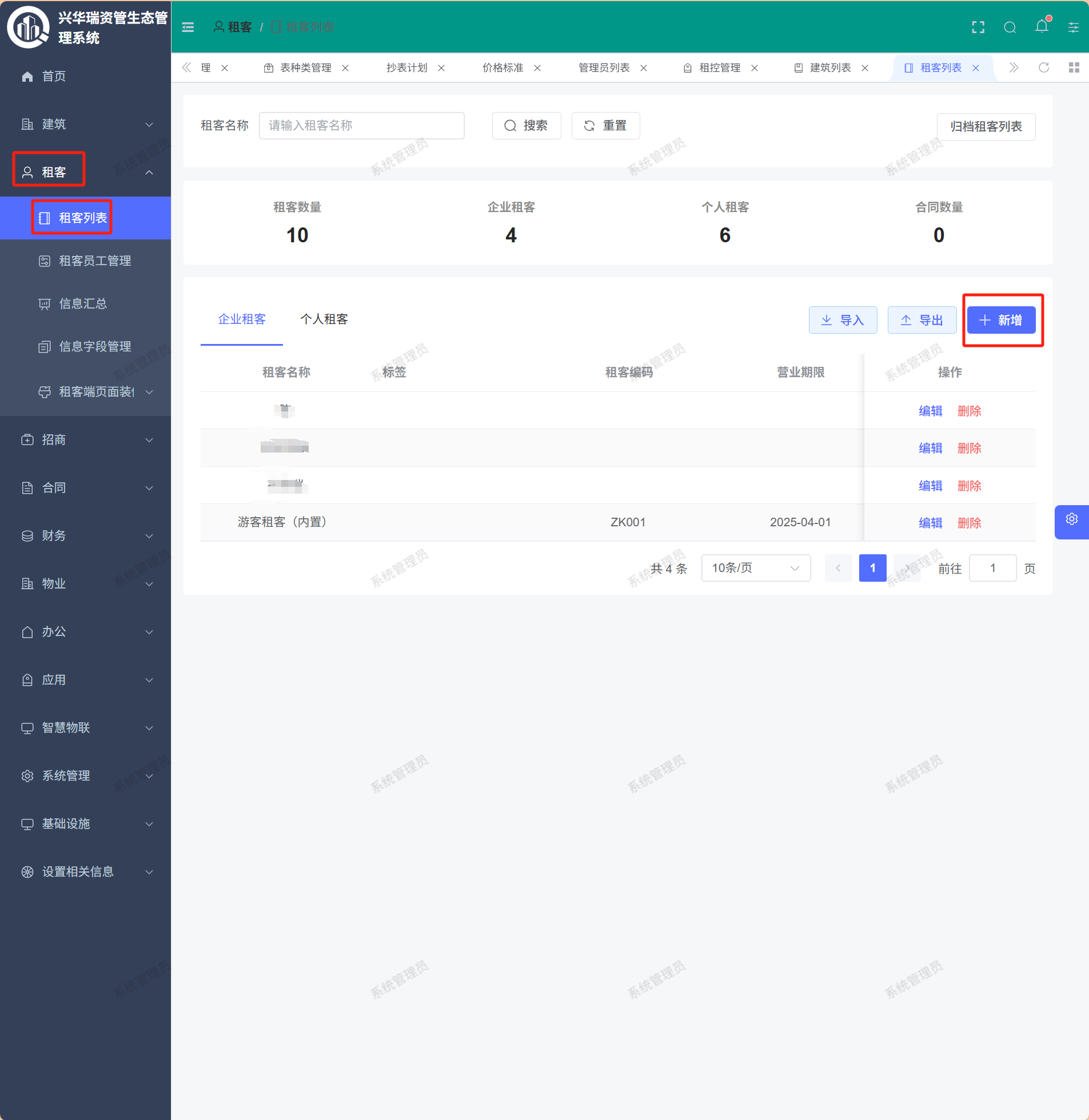 注:新增租客时会自动添加该租客名称的用户,可以使用新增的用户及默认的密码123456登陆系统。添加租客时选择归档即为不看到该租客信息